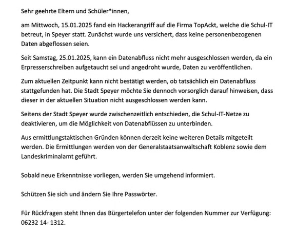 Im Januar 2025 traf ein Ransomware-Angriff der international berüchtigten Hackergruppe LockBit die IT-Infrastruktur von rund 45 Schulen in der Vorderpfalz. Die Angreifer drangen über die Systeme des IT-Dienstleisters Topackt IT Solutions GmbH in Speyer ein, der das Schulnetzwerk „DNSX“ betreibt. Allein in Speyer waren 14 allgemeinbildende Schulen und die Berufsbildende Schule betroffen. Die Folge: verschlüsselte Server, wochenlanger Ausfall digitaler Unterrichtsmittel – und der Diebstahl gewaltiger Datenmengen.